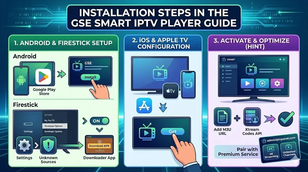 Apple users will find the installation incredibly seamless. Navigate to the Apple App Store on your iPhone, iPad, or Apple TV, search for the application by name, and initiate the installation. This section of our GSE smart iptv player guide emphasizes that the Apple ecosystem handles the application flawlessly, preventing memory leaks and buffering. This is especially true when loading high-quality 4K streaming links from Admin IPTV Panel, which ensures your multi-device compatibility needs are fully met within the Apple infrastructure.